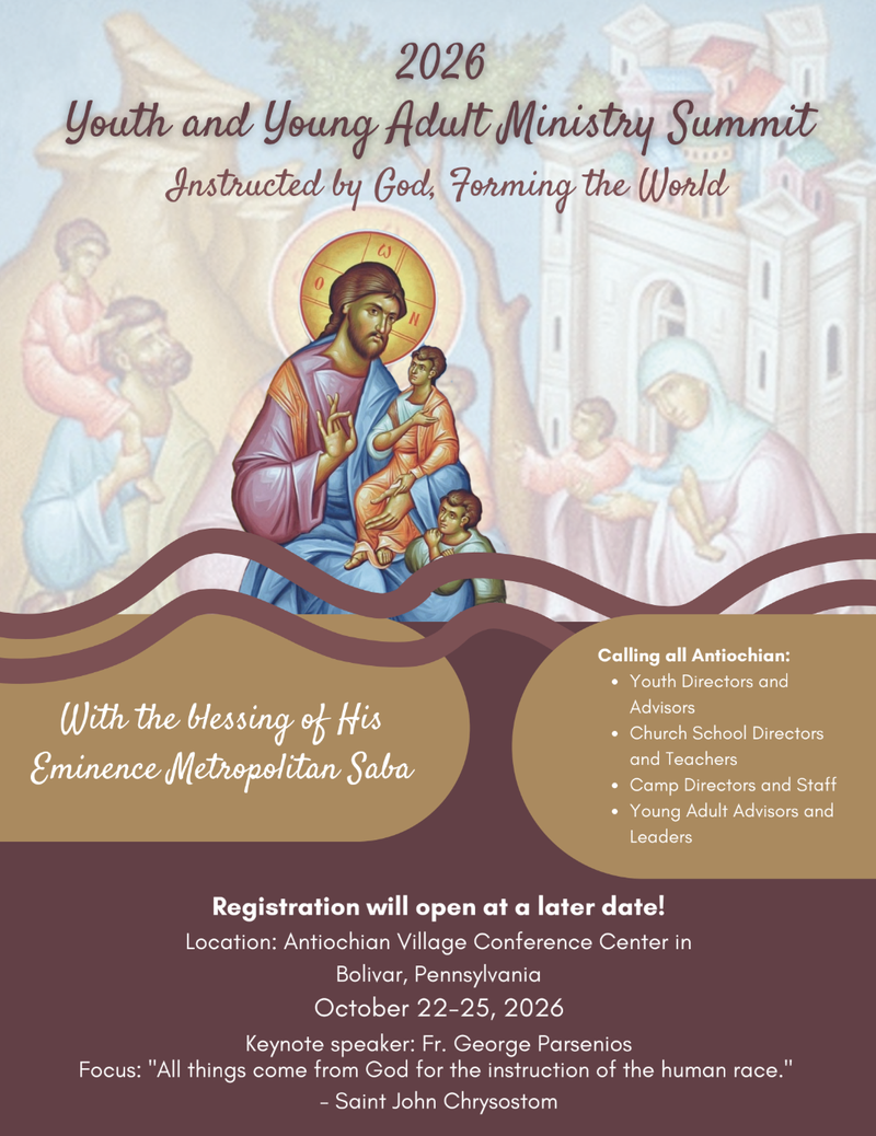 Save the date for the 2026 Youth and Young Adult Ministry Summit, October 22-25 at Antiochian Village. The Summit is open to all Youth Directors and Advisors, Church School Directors and Teachers, Camp Directors and Staff, Young Adult Advisors and Leaders. We will welcome Fr. George Parsenios as the keynote speaker.