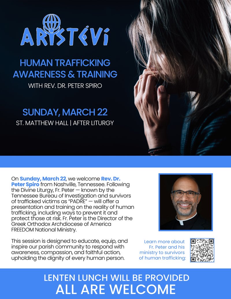 On Sunday, March 22, we welcome Rev. Dr. Peter Spiro from Nashville, Tennessee. Following the Divine Liturgy, Fr. Peter—known by the Tennessee Bureau of Investigation and survivors of trafficked victims as “PADRE”—will offer a presentation and training on the reality of human trafficking, including ways to prevent it and protect those at risk. Fr. Peter is the Director of the Greek Orthodox Archdiocese of America FREEDOM National Ministry.
